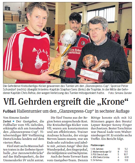 Am Samstag trafen sich erneut die Mannschaften des VfL Gehrden, SV Gohrau, FSG Steutz Leps, BSV Vorfläming Lindau und der Walternienburger SV um den jährlich stattfindenden Pokal der Firma Glanzexpress auszuspielen.
