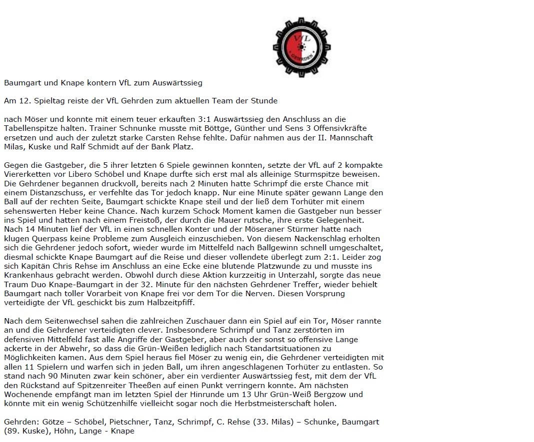 Zum letzten Auswärtsspiel der Hinrunde reiste der VfL nach Möser. S. Götze berichtet .