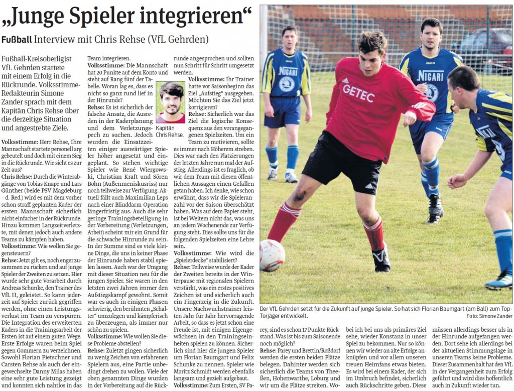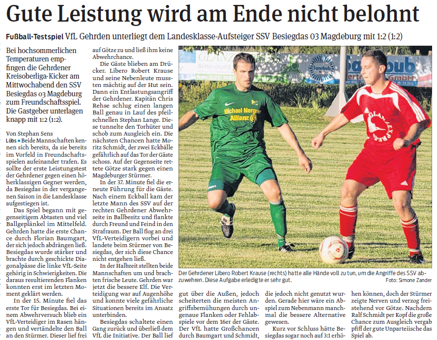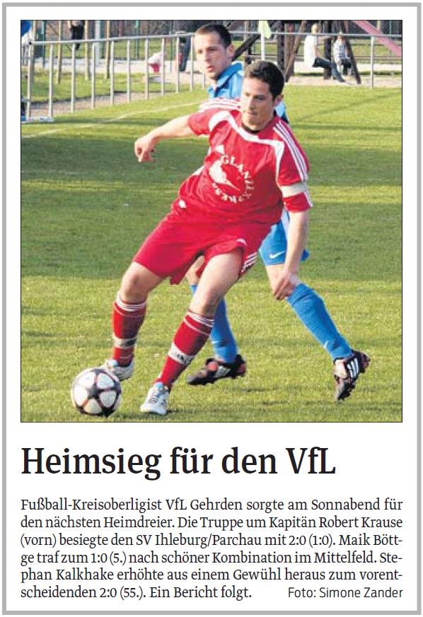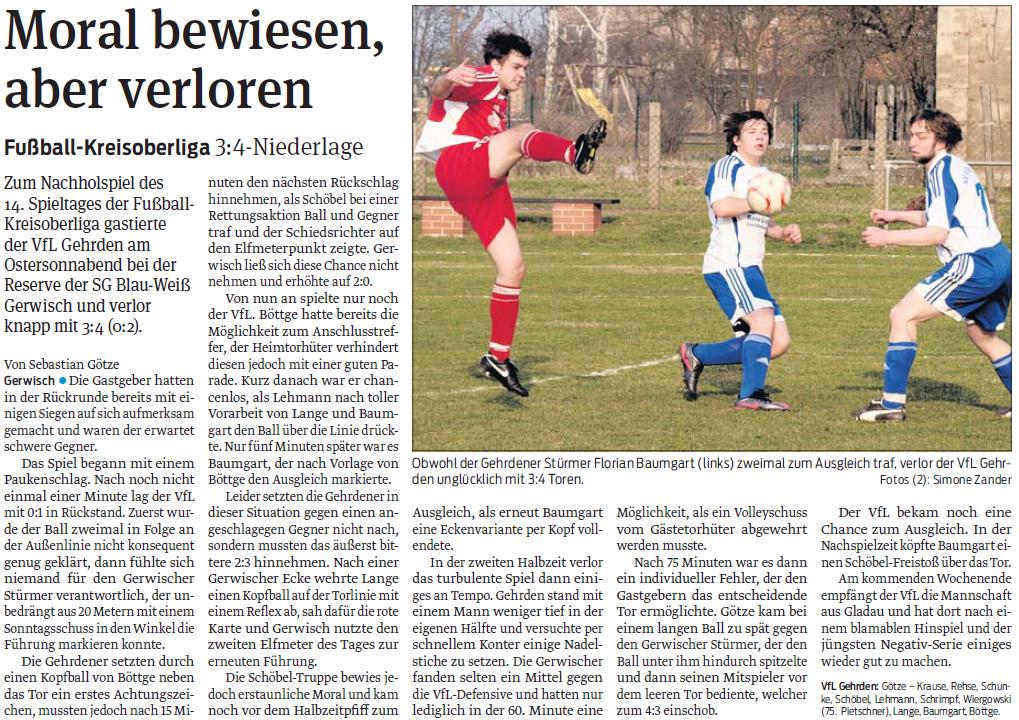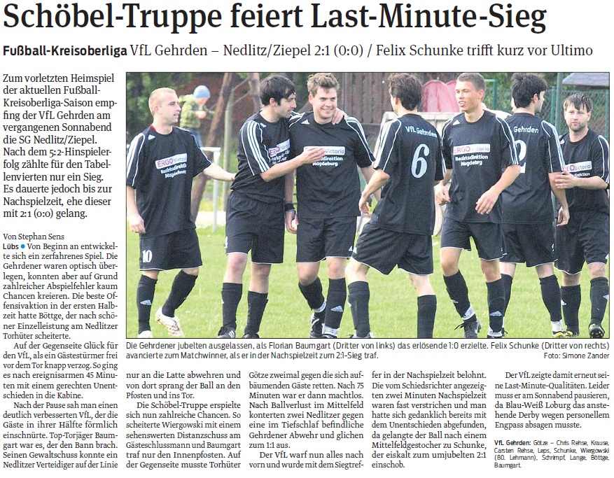 Danach war Schluss und alle waren sich einig, den Zuschauer ein sehenswertes Spiel mit vielen Chancen geboten zu haben. Gehrden zeigte sich spiel- und lauffreudig, was die Chancen betraf allerdings wie so oft, zu fahrlässig. Im Spitzenspiel nächste Woche gegen den Tabellenführer aus Parey wird sich zeigen, ob die Gehrdener ihren guten Lauf fortsetzen und den hoffentlich zahlreichen Zuschauern ein spannendes Spiel bieten können. Anstoß ist 15 Uhr auf dem Sportplatz in Lübs.